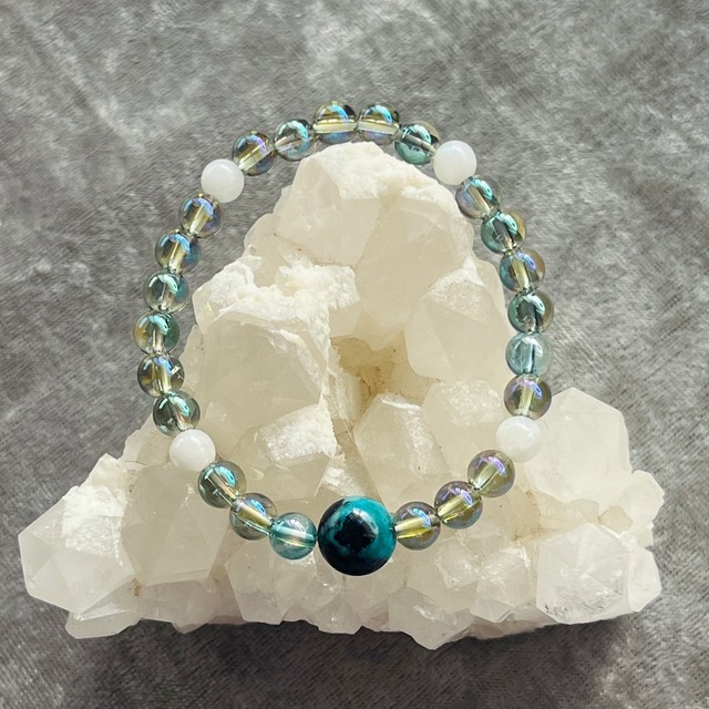 深みのあるクリソコラをポイントに、 ムーンストーンのやわらかな白と、 グリーンオーラの透明感を組み合わせました。 心を静かに整えたいとき、 力を抜いて自然体で過ごしたいときに、 そっと寄り添ってくれるような一本です。 天然石の模様や表情はひとつとして同じものがありません。 世界にひとつだけの景色を楽しんでいただけたら嬉しいです。 このブレスレットの内径は 約15.5cmです 手首サイズが 14.5〜15cm の方におすすめです ※こちらの商品は受注生産ではなく、【現品販売】です。掲載写真の商品をお届けいたします。 ─────────────── ■使用した石 ・クリソコラ 10mm ・ムーンストーン 6mm ・グリーンオーラ 6mm ※天然石の性質上、色のバラつき、インクルージョン(内包物)がございます ■サイズ 内径 約15.5cm ─────────────── ・配送は、クリックポストを使用します ・ご不明な点はご購入前にお問い合わせください ───────────────