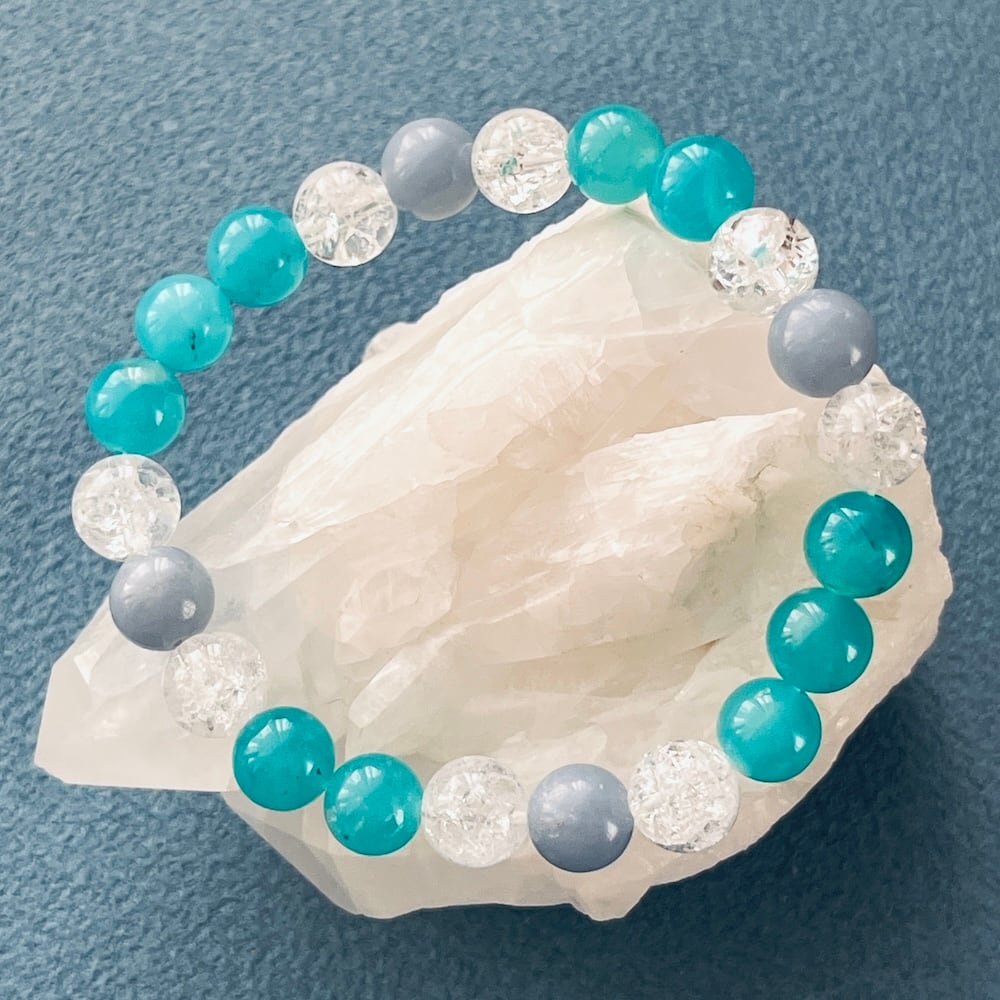 使用しているのは アマゾナイト、エンジェライト、そして クラック水晶。